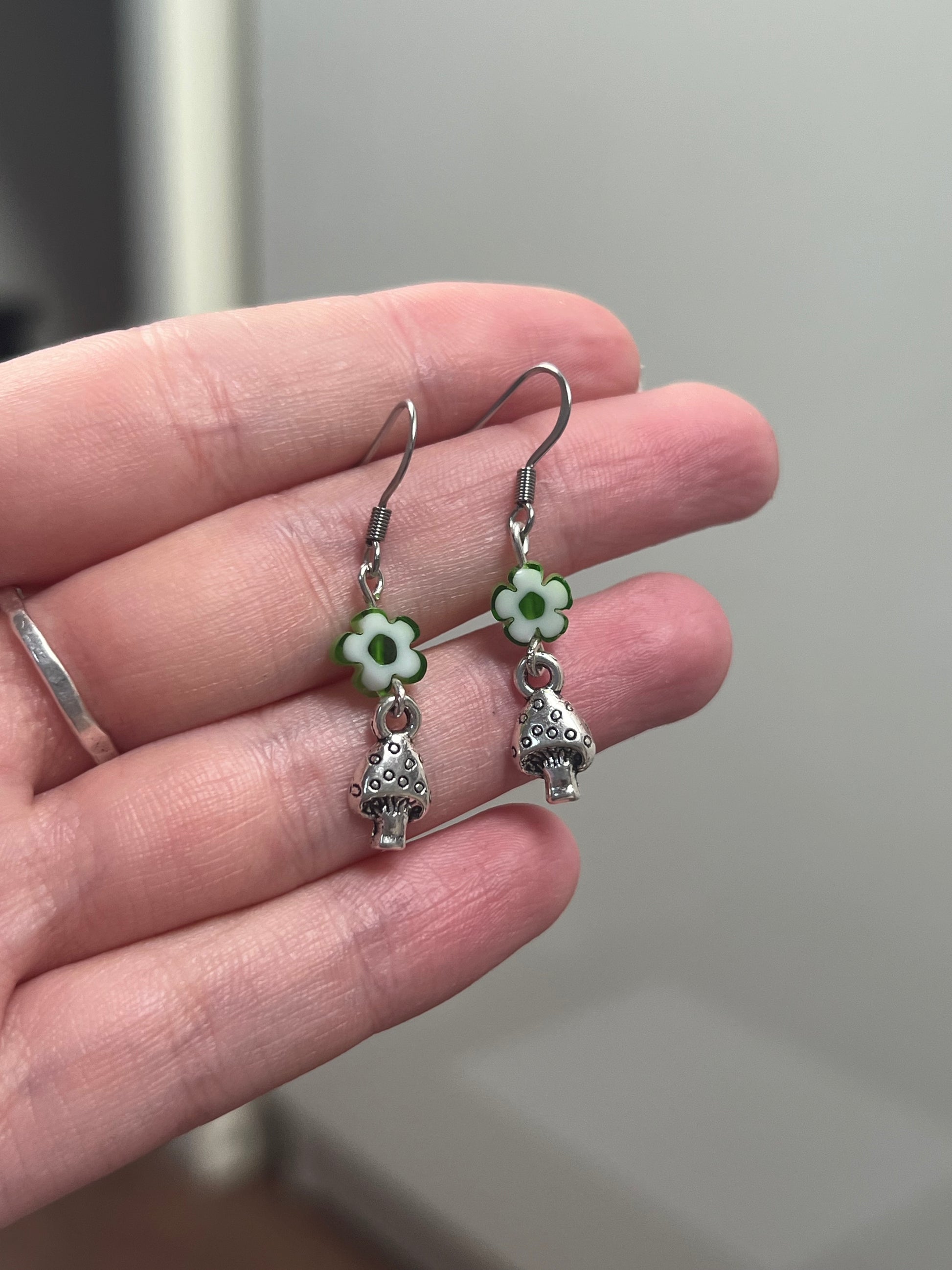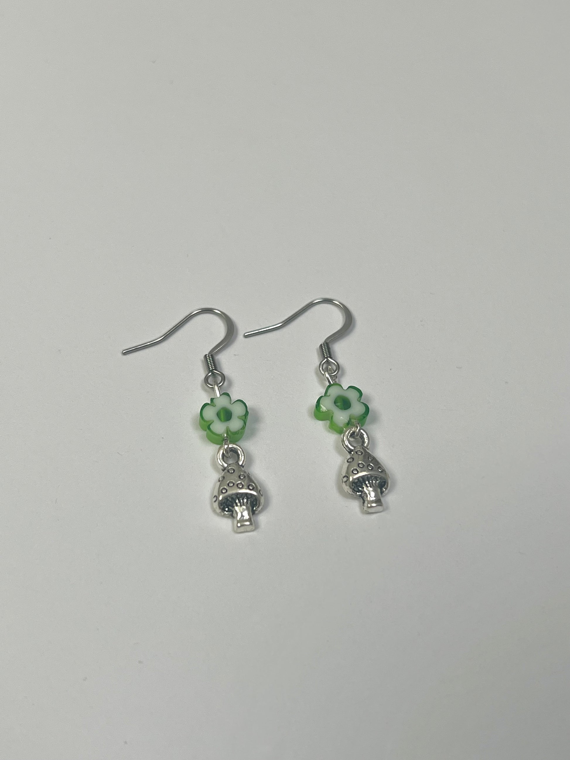 Glass flower beads and silver mushroom charms on sterling silver hooks.