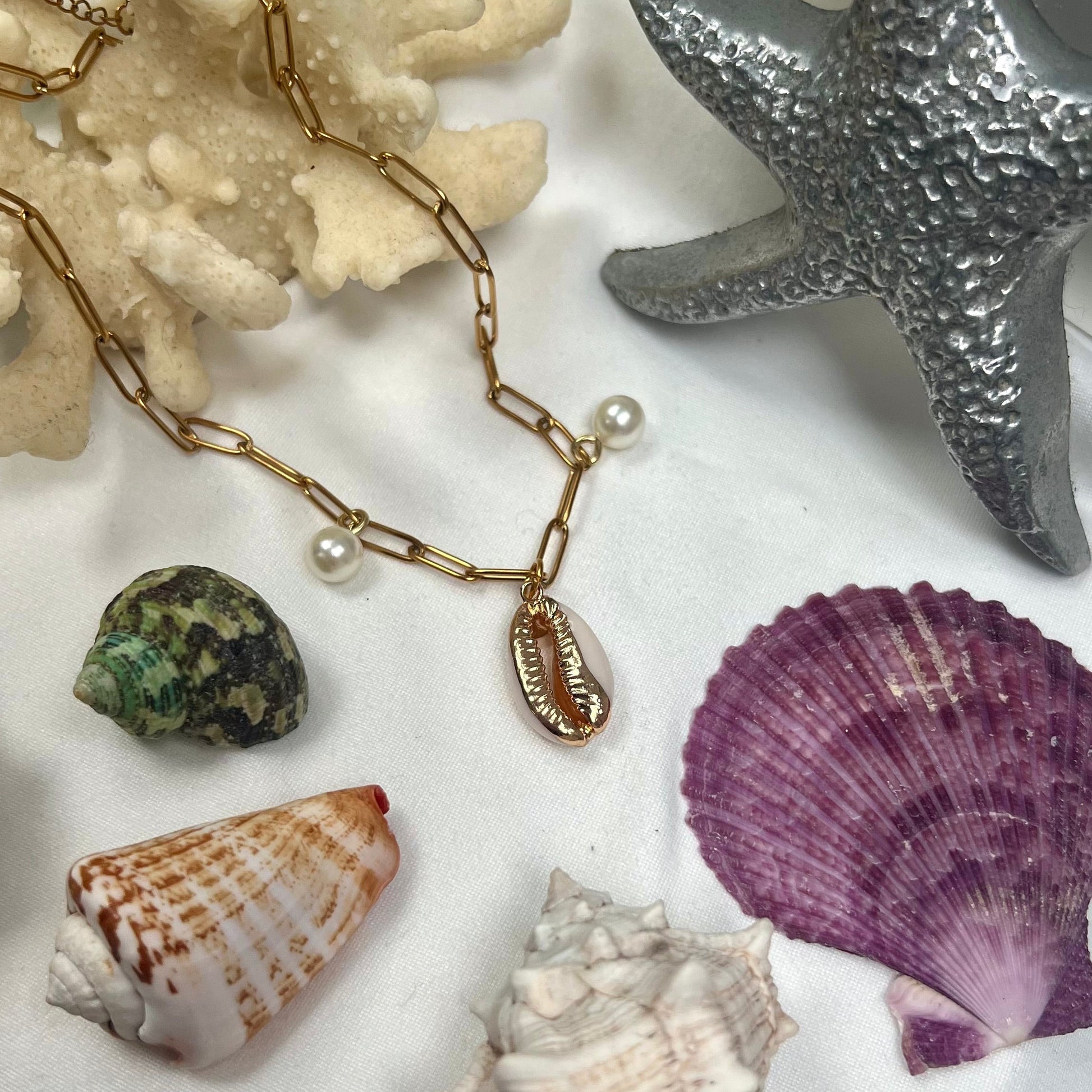 Handmade using a stainless steel gold-plated chain, faux pearls and a cowrie shell painted with gold.