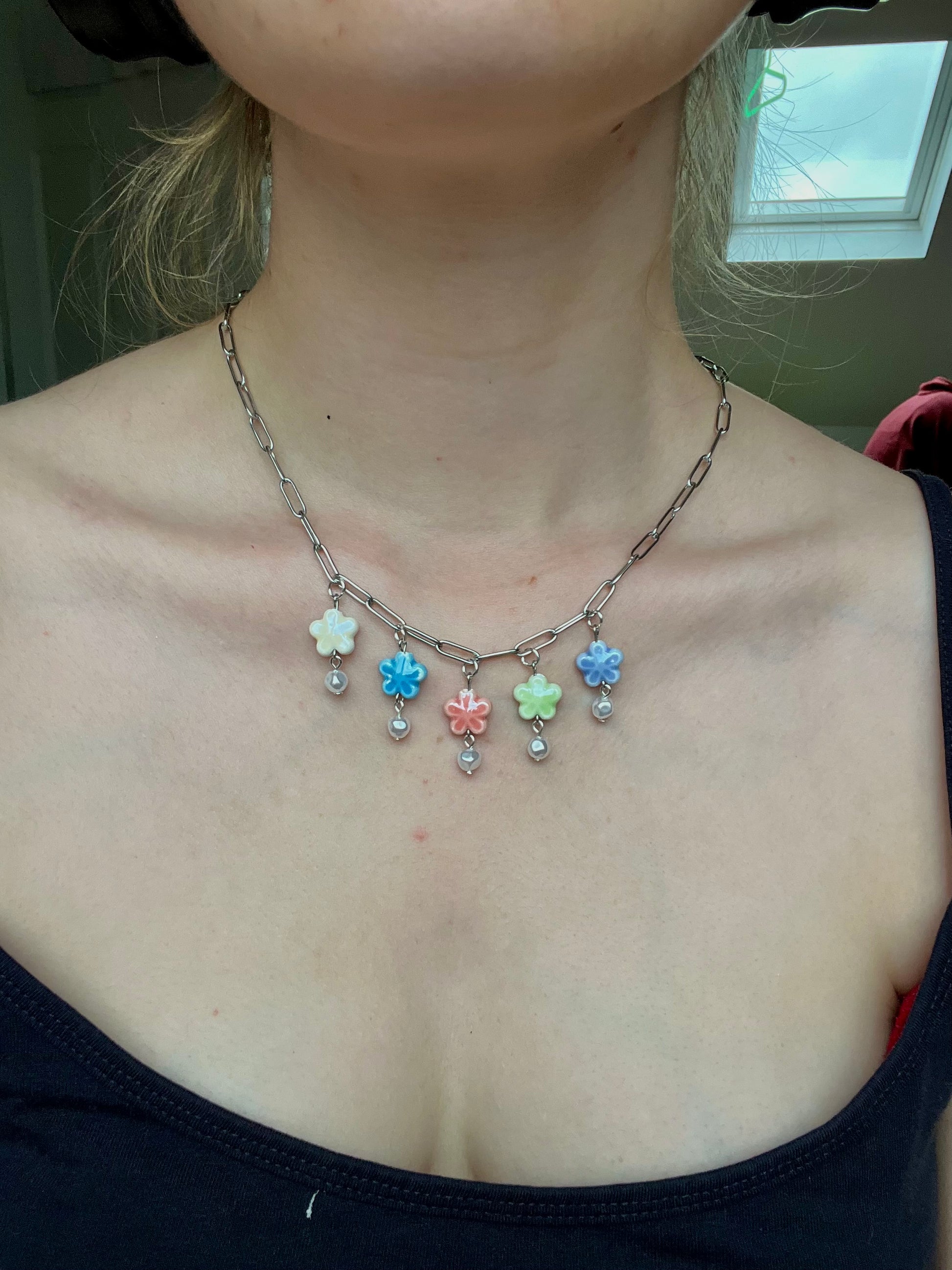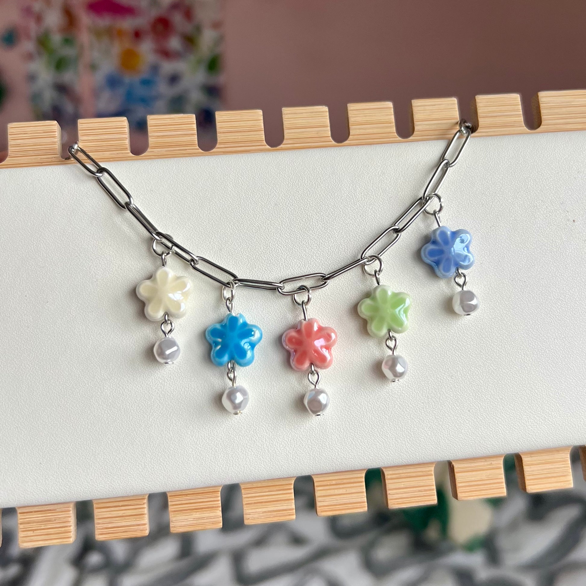 Stainless steel chain with ceramic flower beads and pearls. Length is adjustable. Matching earrings also available!