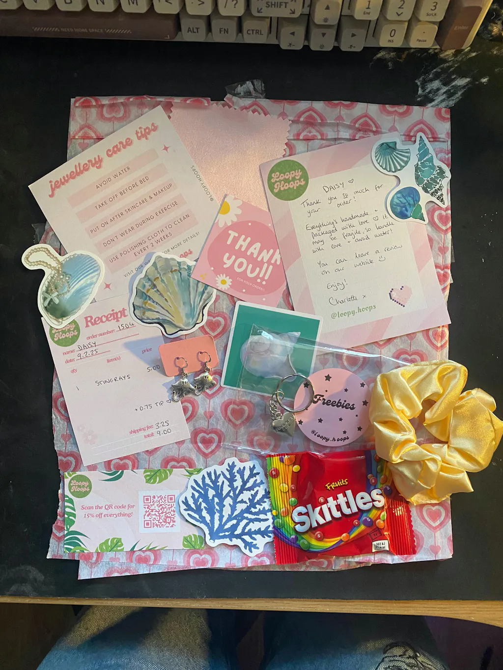 The earrings are so cute & good quality. You get free stickers + more! An adorable hand written thank you note and a Jewellery care package. Would definitely recommend someone to buy! 🙌🏻🫧 Also a lovely owner, thank you so so much!
