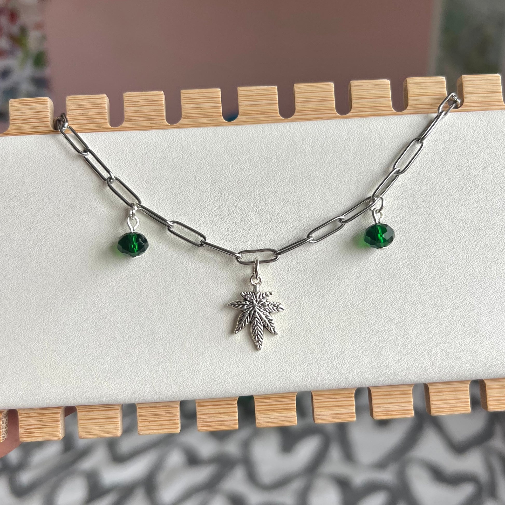 Stainless steel chain with silver charm and glass beads. Length is adjustable.